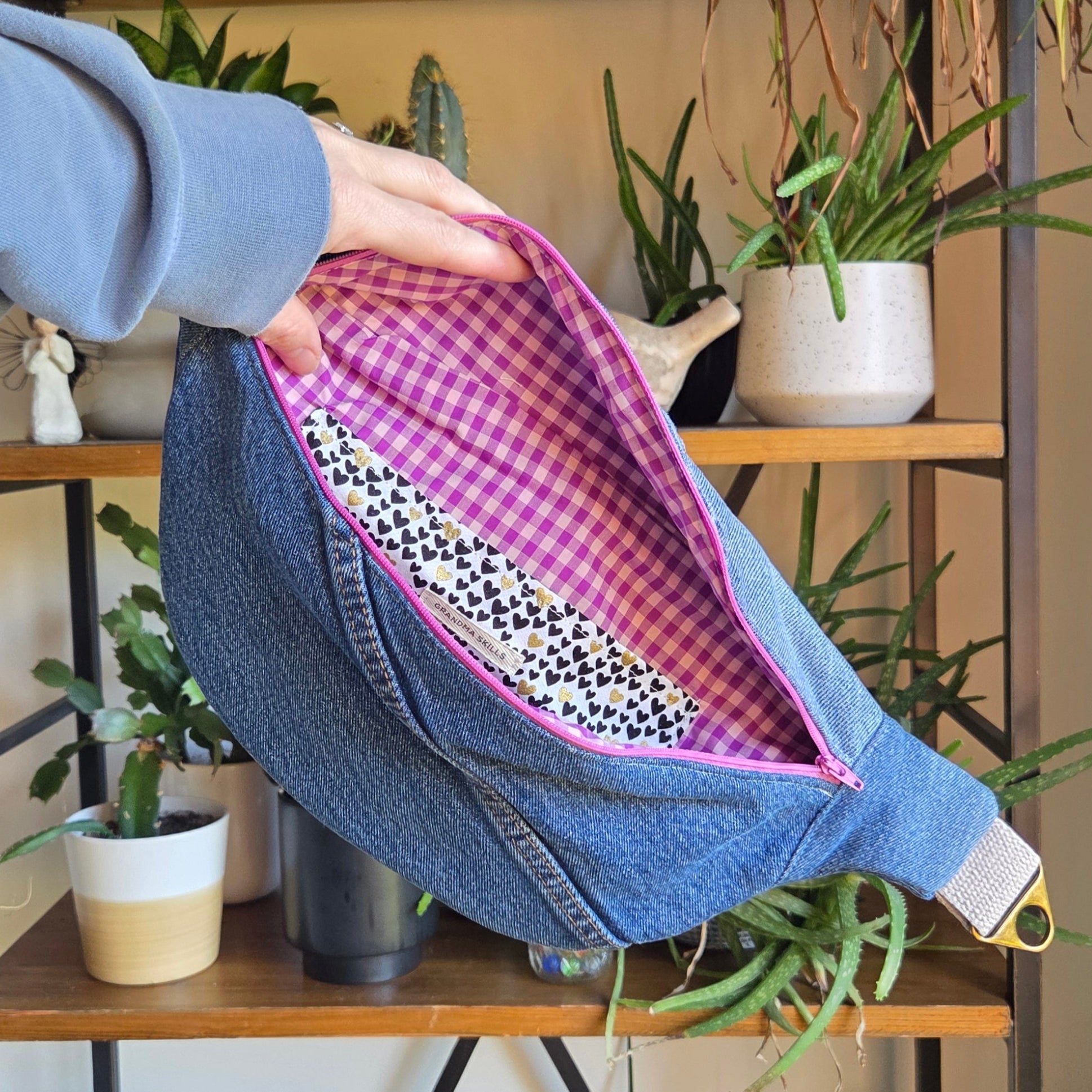 Carry your essentials with style and sustainability in this handcrafted upcycled denim fanny pack.