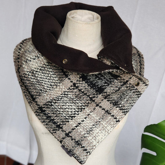 A Grandma Skills Snap Cowl is a great addition to your winter wardrobe and can easily be styled for an everyday casual look or dressed up for a fancier occasion. Simply pair your cowl with a coordinating shirt/outfit and you're good to go! This allows for a effortless stylish look. If you need to wear your jacket or vest the thin back profile of the cowl allows you to wear it under them without being bulky like traditional scarf. If you're wanting to show your Snap Cowl off you can also wear it over your jacket or vest for a different look.