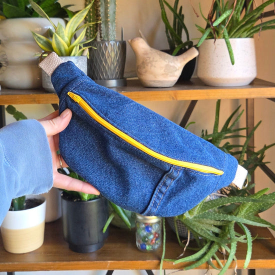 Carry your essentials with style and sustainability in this handcrafted upcycled denim fanny pack.