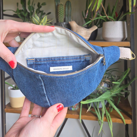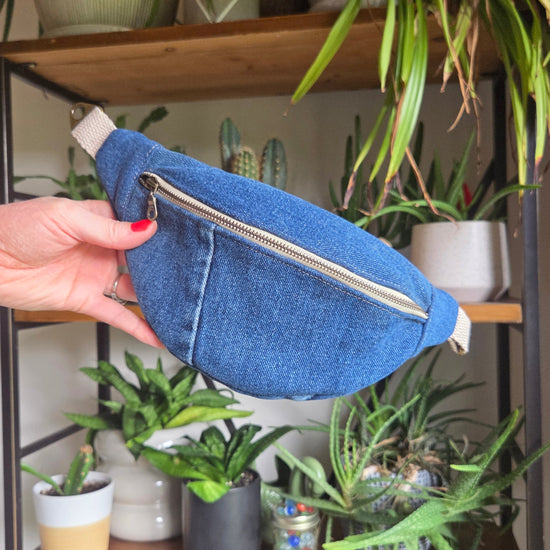 Carry your essentials with style and sustainability in this handcrafted upcycled denim fanny pack.