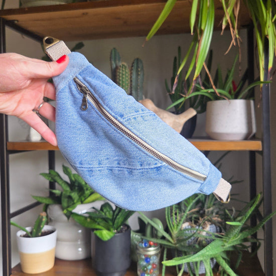 Carry your essentials with style and sustainability in this handcrafted upcycled denim fanny pack.