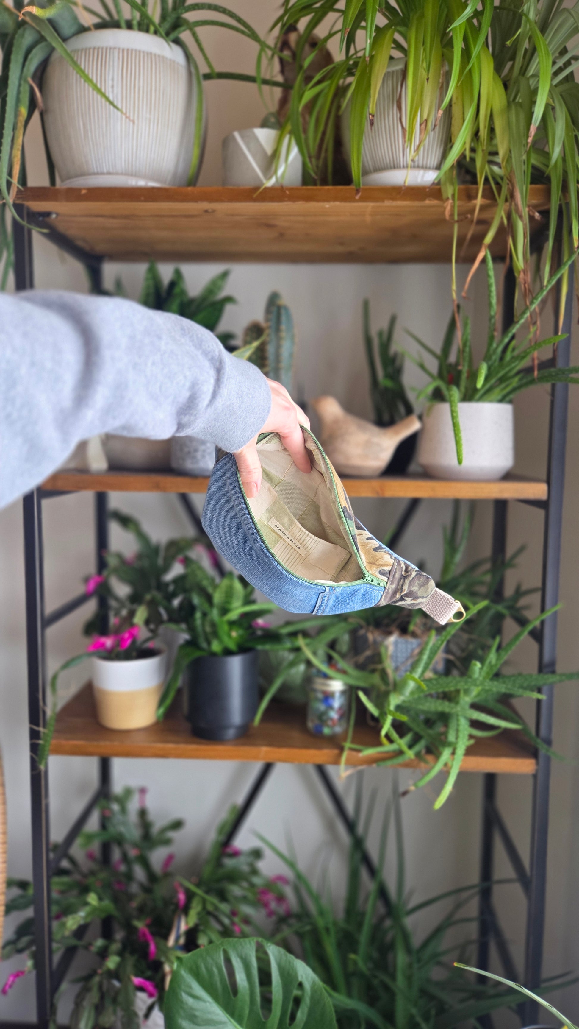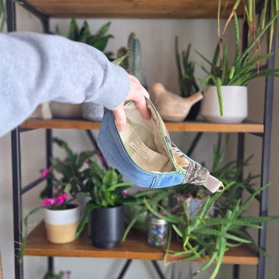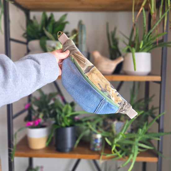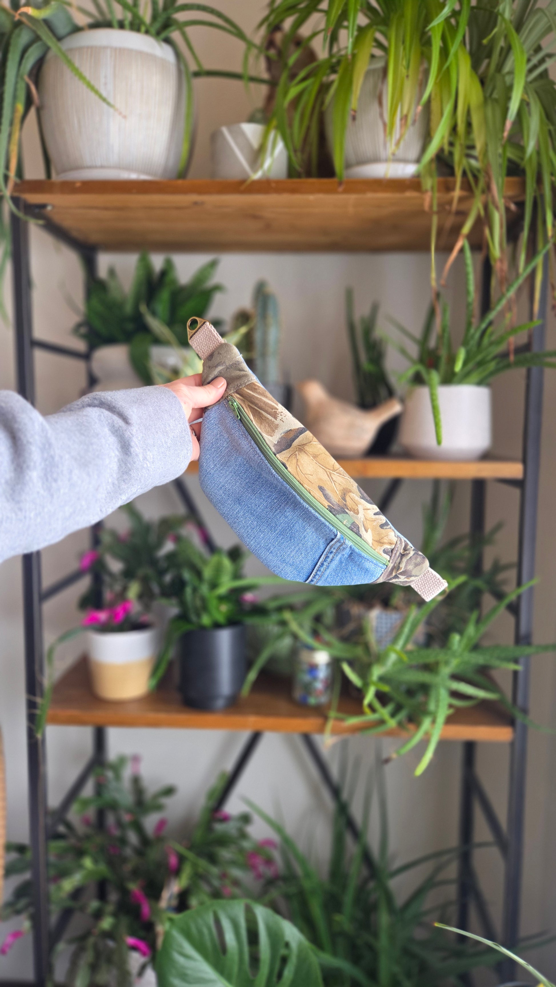 Carry your essentials with style and sustainability in this handcrafted upcycled denim fanny pack.
