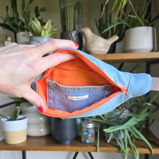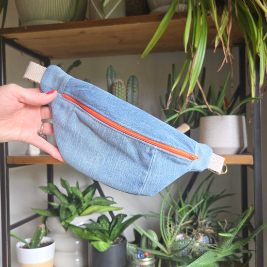 Carry your essentials with style and sustainability in this handcrafted upcycled denim fanny pack.
