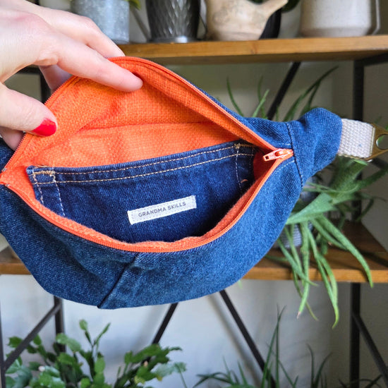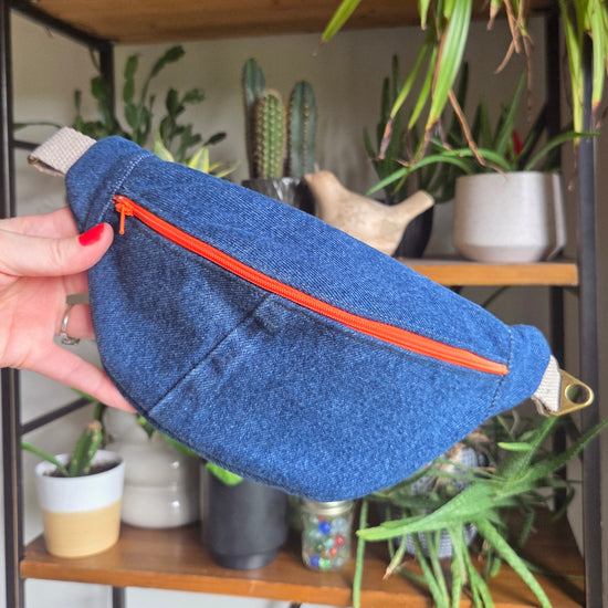 Carry your essentials with style and sustainability in this handcrafted upcycled denim fanny pack.