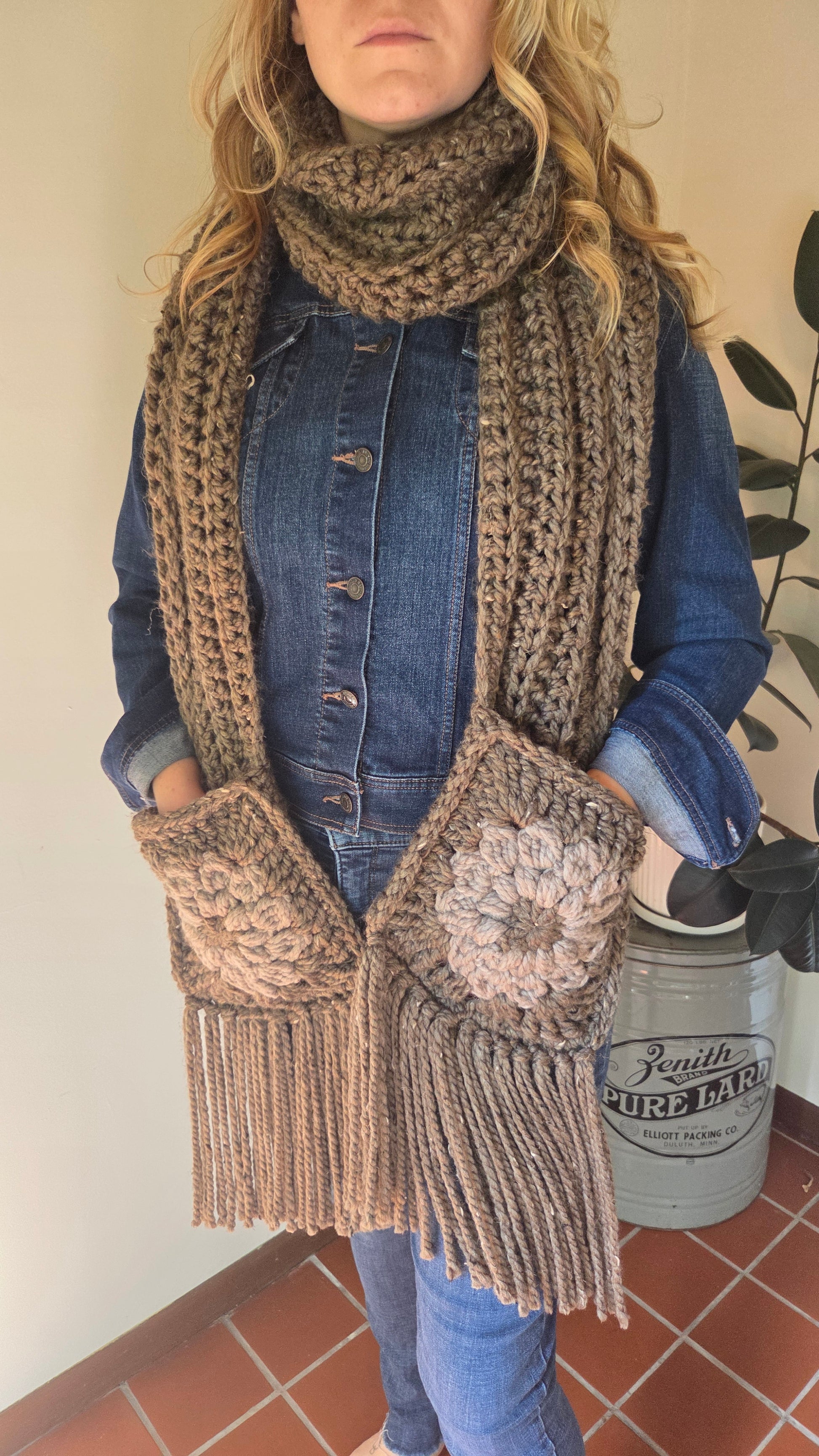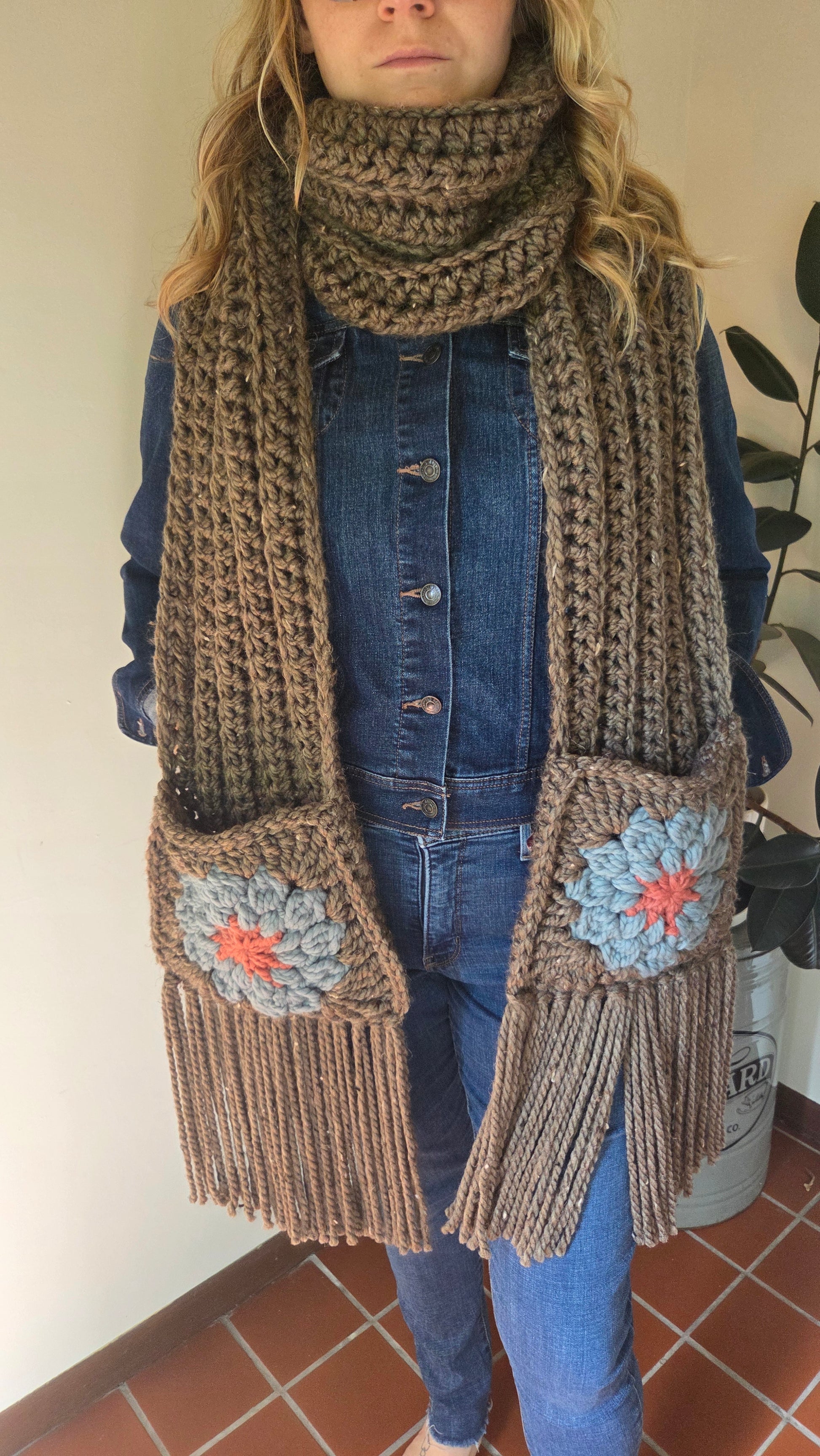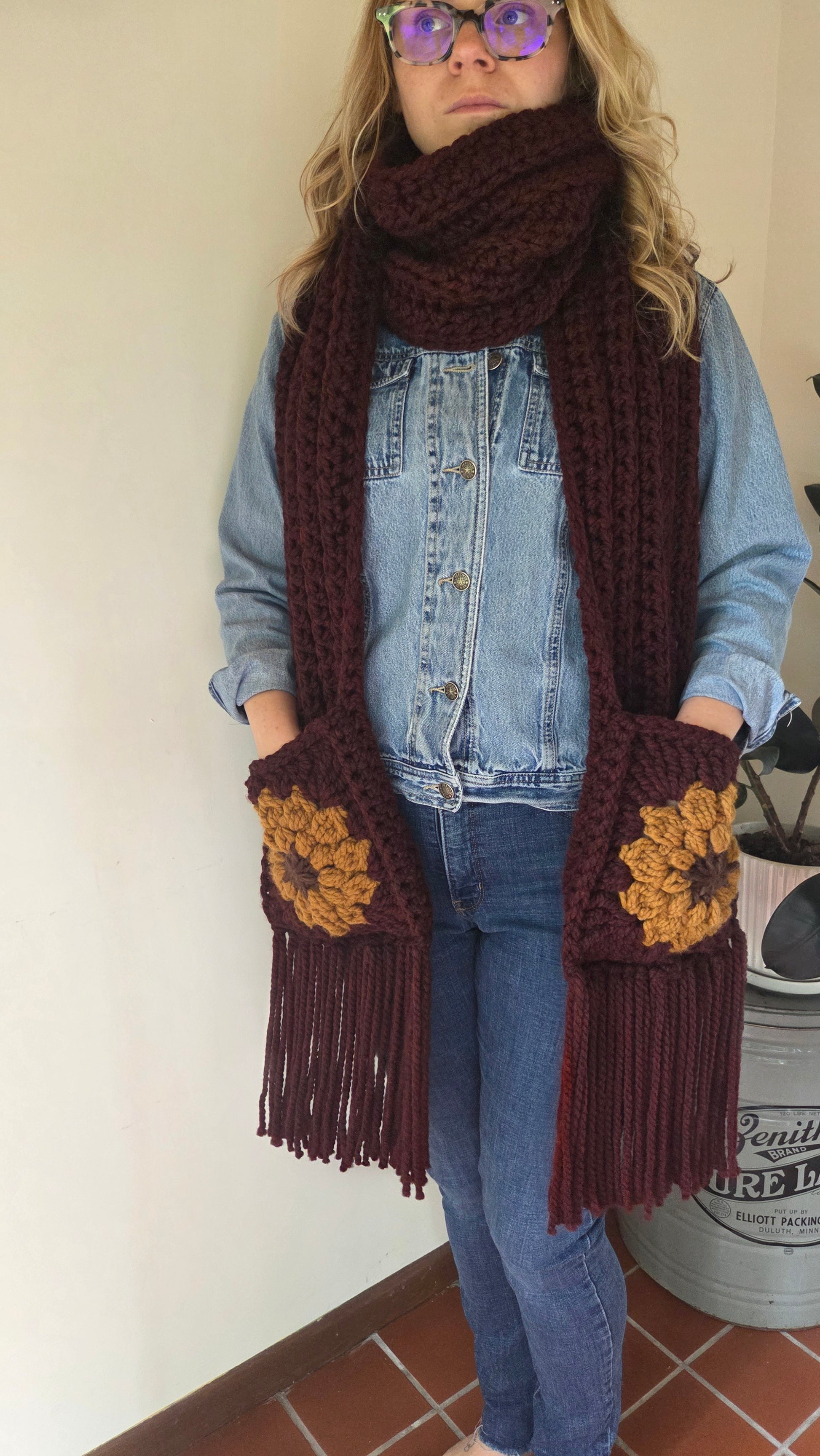 A Grandma Skills original design, the pocket sunflower scarf is sure to be a showstopper with your fall wardrobe. Created with a bulky wool-blend yarn it's sure to keep you warm and looking like a fashionista. The pockets hit a perfect height when the scarf is looped around your neck. You can also drape the scarf around your shoulders for a modern look.